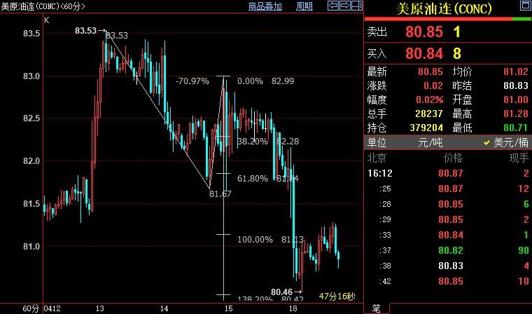 北京时间16:14,NYMEX原油期货下跌0.09%至80.76美元/桶;ICE