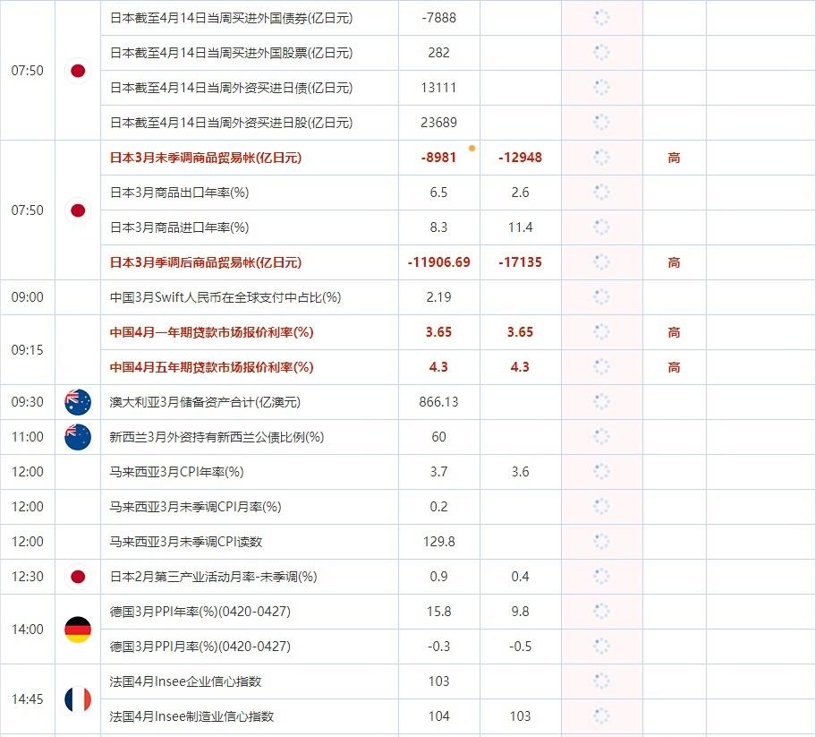 07:50 日本3月季调后商品贸易帐(亿日元) , 前值 -11906.69 , 预期值 -17135 , 公布值:待发布09:00 中国3月Swift人民币在全球支付中占比(%) , 前值 2.19 , 预期值 -- , 公布值:待发布
