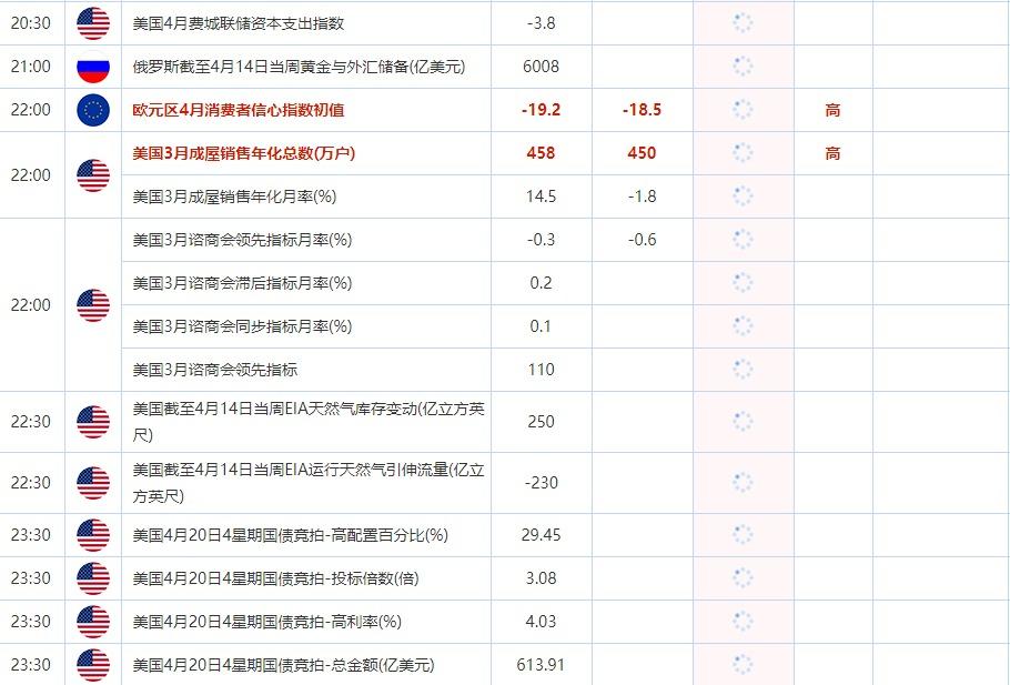 22:00 欧元区4月消费者信心指数初值 , 前值 -19.2 , 预期值 -18.5 , 公布值:待发布22:00 美国3月成屋销售年化总数(万户) , 前值 458 , 预期值 450 , 公布值:待发布22:00 美国3月成屋销售年化月率(%) , 前值 14.5 , 预期值 -1.8 , 公布值:待发布