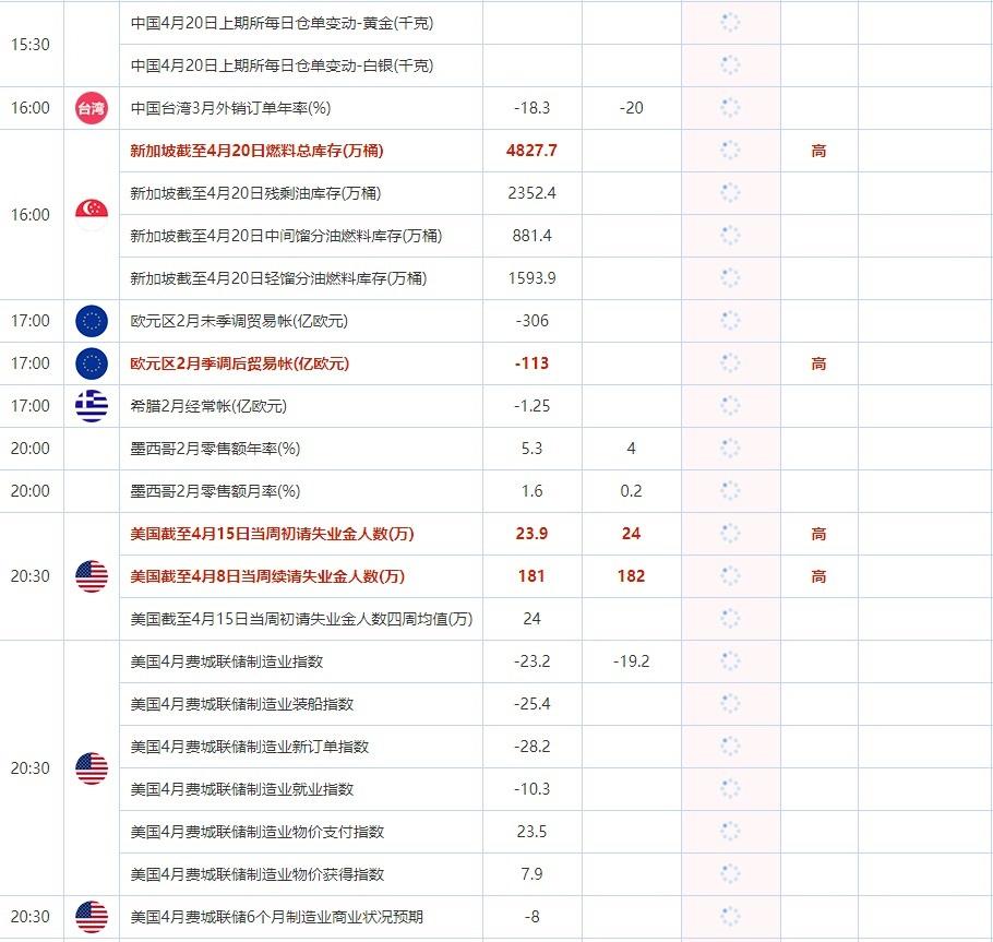 20:30 美国截至4月15日当周初请失业金人数(万) , 前值 23.9 , 预期值 24 , 公布值:待发布
