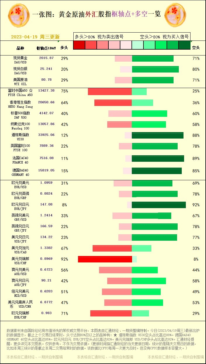 一张图:黄金原油外汇股指"枢纽点+多空占比"一览(2023/04/19周三)