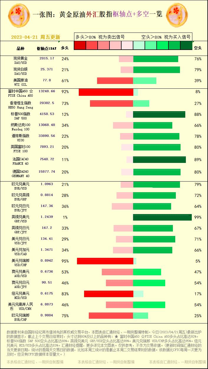 一张图:2023/04/21黄金原油外汇股指"枢纽点+多空占比"一览