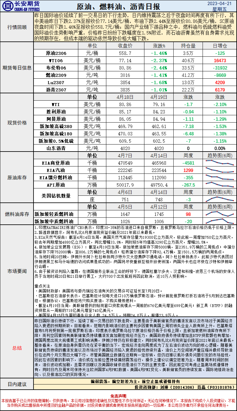 标题:长安期货4月21日原油报告:衰退担忧持续压制油价,需求支撑下前空离场