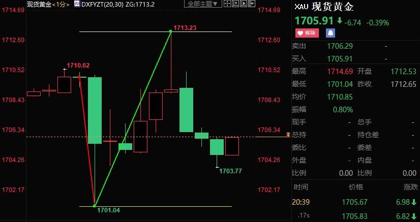现货黄金剧震逾12美元,低点和高点分别为1701.04美元/盎司和1713.23美元/盎司。