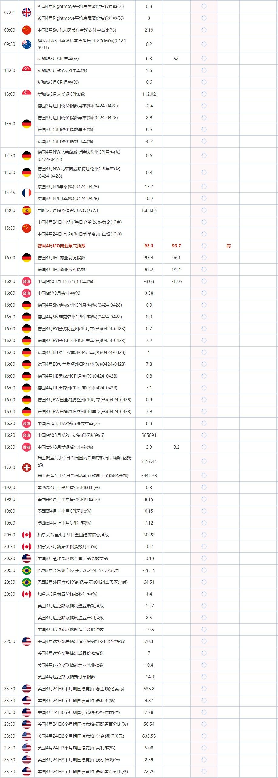 13:00 新加坡3月CPI年率(%) , 前值 6.3 , 预期值 5.6 , 公布值:待发布13:00 新加坡3月核心CPI年率(%) , 前值 5.5 , 预期值 -- , 公布值:待发布