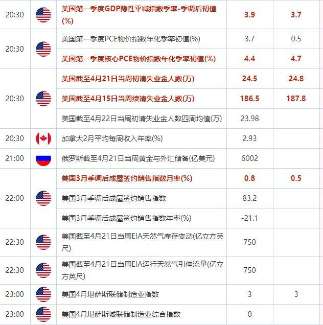 20:30 美国第一季度核心PCE物价指数年化季率初值(%) , 前值 4.4 , 预期值 4.7 , 公布值:待发布20:30 美国截至4月21日当周初请失业金人数(万) , 前值 24.5 , 预期值 24.8 , 公布值:待发布20:30 美国截至4月15日当周续请失业金人数(万) , 前值 186.5 , 预期值 187.8 , 公布值:待发布20:30 美国截至4月22日当周初请失业金人数四周均值(万) , 前值 23.98 , 预期值 -- , 公布值:待发布