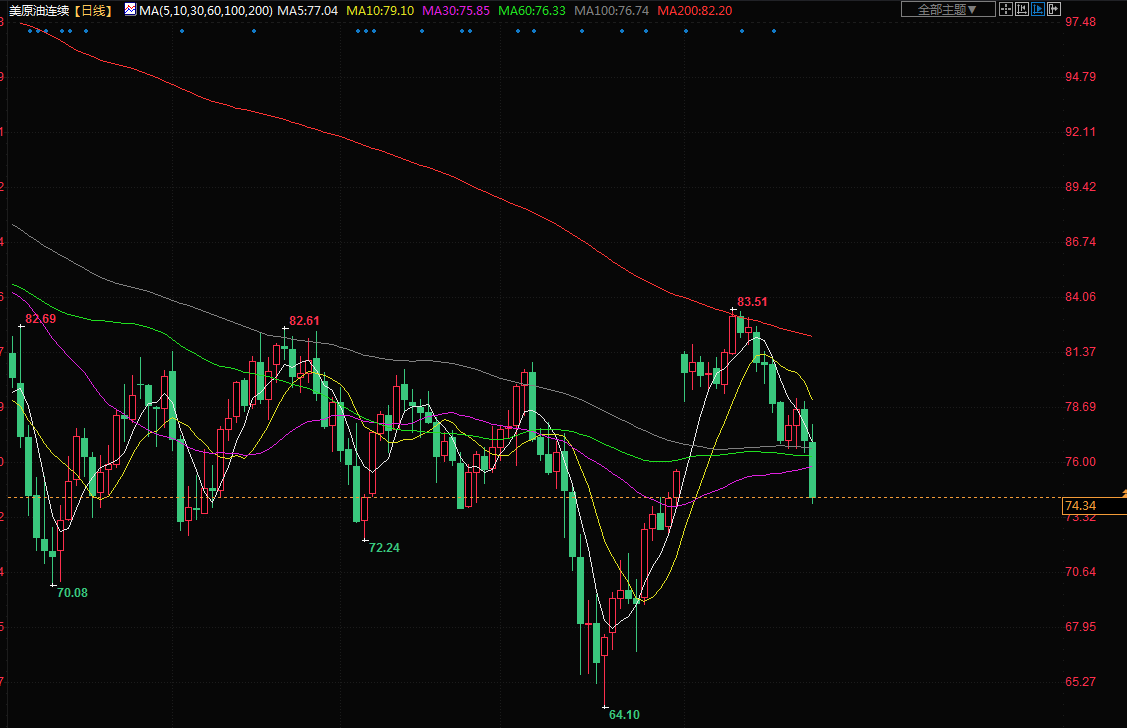 商品收盘情况:布伦特原油期货收于每桶77.69美元,下跌3.8%。美国原油收于每桶74.30美元,下跌3.6%;美国期金下滑0.4%至1996.20美元。