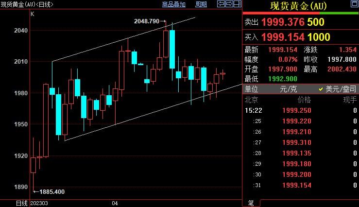 现货黄金下跌0.14%至1993.33美元/盎司;COMEX期金主力合约下跌0.07%至2003.3美元/盎司;