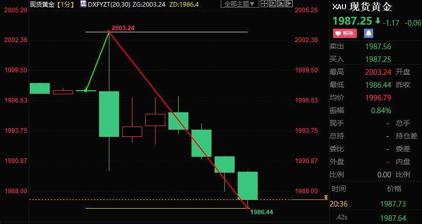 现货黄金下跌逾11美元至1986.44美元/盎司,累计波动近17美元。
