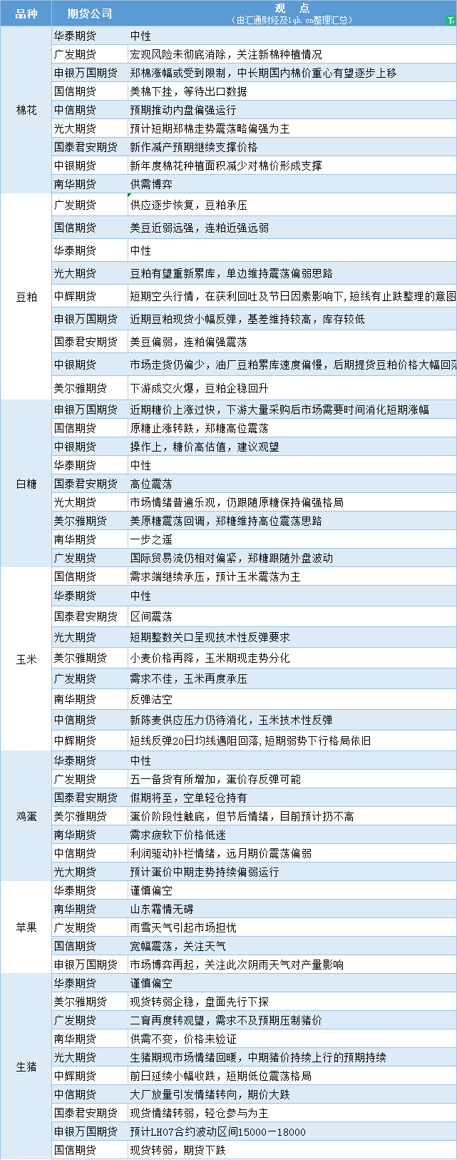 标题:期货公司观点汇总一张图:4月27日农产品(棉花、豆粕、白糖、玉米、鸡蛋、生猪等)