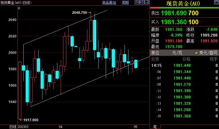 现货黄金下跌0.06%至1989.78美元/盎司;COMEX期金主力合约下跌0.01%至1998.9美元/盎司;