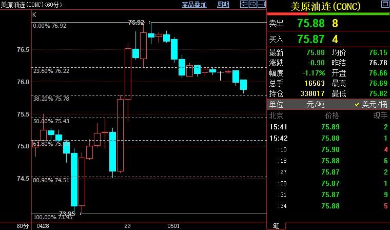 NYMEX原油短线下看75.43美元
