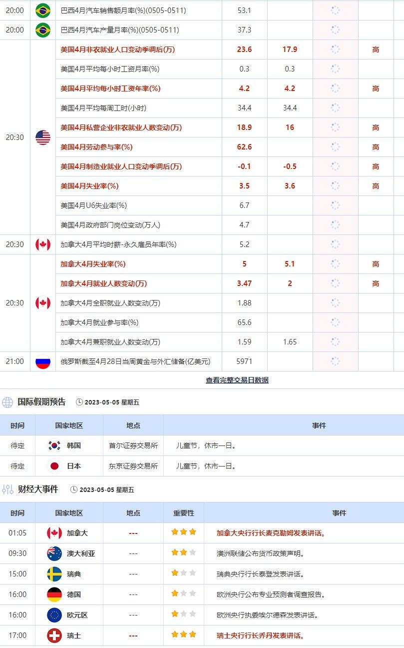 20:30 美国4月非农就业人口变动季调后(万) , 前值 23.6 , 预期值 17.9 , 公布值:待发布20:30 美国4月平均每小时工资月率(%) , 前值 0.3 , 预期值 0.3 , 公布值:待发布
