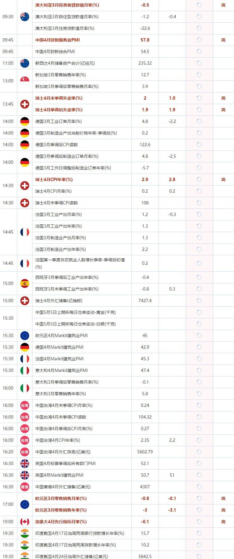 09:45 中国4月财新服务业PMI , 前值 57.8 , 预期值 -- , 公布值:待发布09:45 中国4月财新综合PMI , 前值 54.5 , 预期值 -- , 公布值:待发布