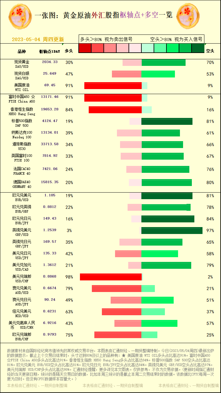 标题:一张图:2023/05/04黄金原油外汇股指"枢纽点+多空占比"一览