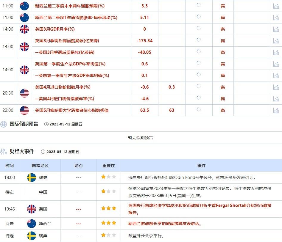 5月8日,欧元区将公布5月Sentix投资者信心指数,市场预期为-8,略好于-8.7的前值。5月8日,英国伦敦证券交易所因查理三世的加冕礼,休市一日。欧洲央行首席经济学家连恩在4月底接受采访时表示,近期数据支持5月继续加息。5月8日,连恩将发表讲话,投资者需关注他的最新观点。