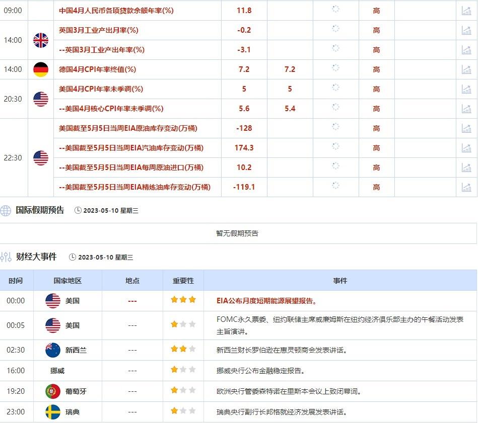 5月9日,美国总统拜登据称与美国国会的四位领导人在白宫就债务上限问题举行会议,结果或对金融市场造成一定影响,投资者需对此保持关注。 ③5月10日(周三)关键字:美国截至5月5日当周API和EIA原油库存变动,美国4月CPI