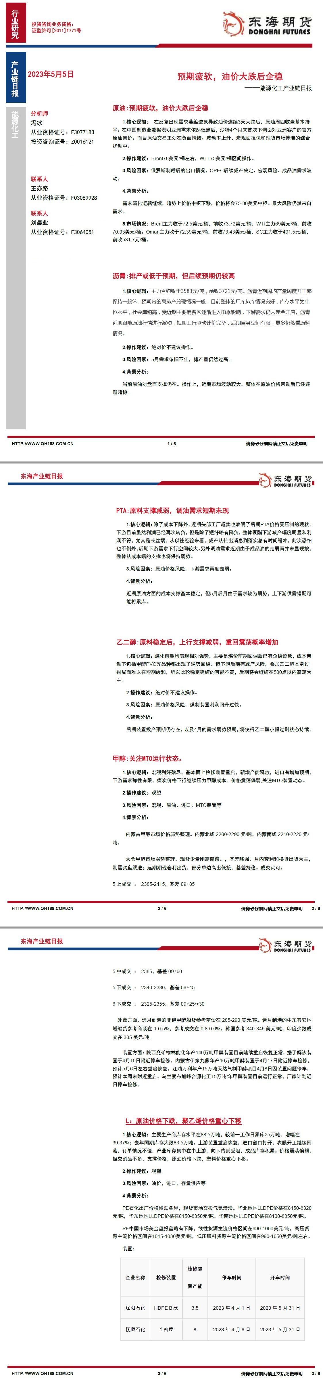 标题:【东海期货5月5日产业链日报】能化篇:预期疲软,油价大跌后企稳