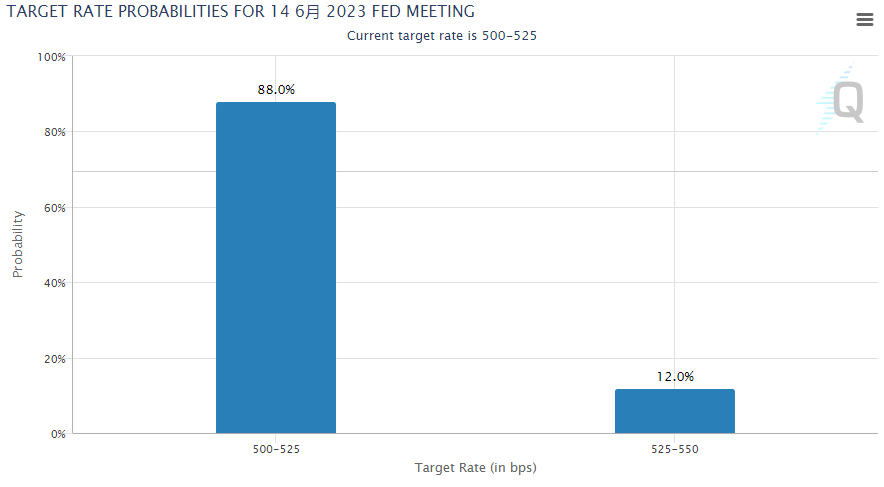 美联储主席鲍威尔上周表示,货币政策决定将继续由数据驱动。交易员目前预计,美联储6月维持利率不变的可能性为88%,暗示加息周期可能暂停。
