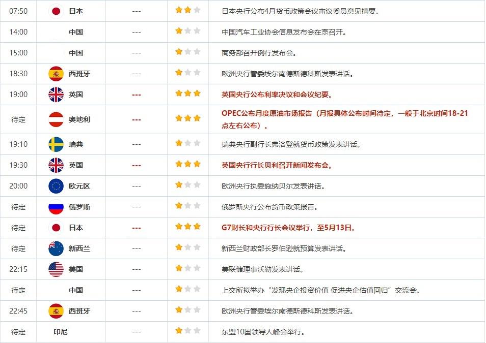 19:00 英国5月央行基准利率(%) , 前值 4.25 , 预期值 4.5 , 公布值:待发布19:00 英国4月央行MPC投票赞成升息(人) , 前值 7 , 预期值 7 , 公布值:待发布
