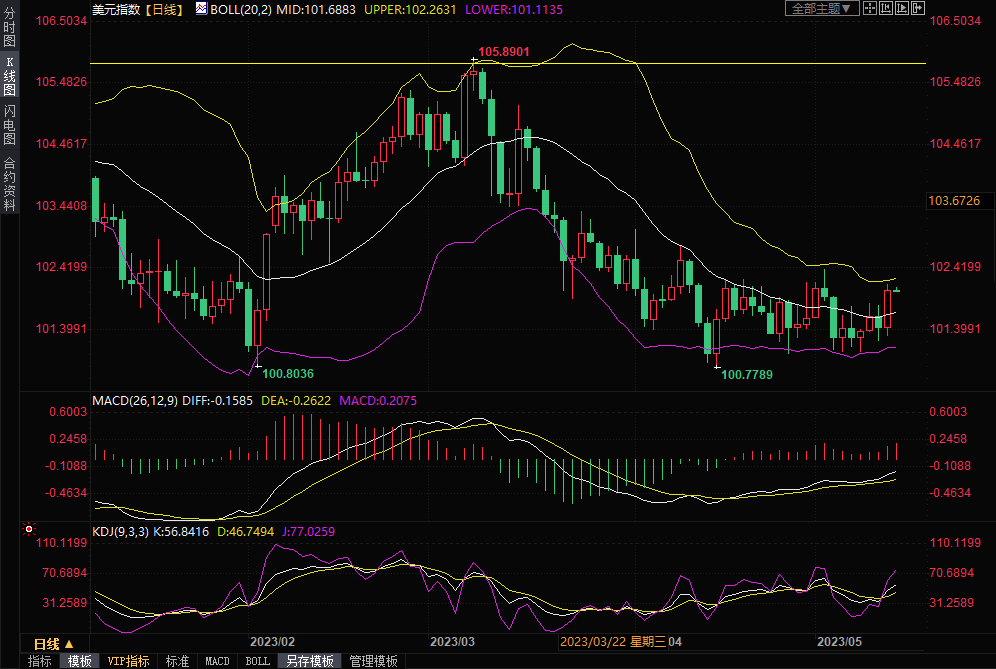 整体来看,虽然避险情绪也给金价提供支撑,但更多的资金涌入美元,美元指数走强对金价压制明显,而且美元短线看涨信号有所增强,这令金价短线面临进一步下行压力,虽然市场预计美联储6月份将暂停加息,但基本已经被市场消化,短线可能无法给金价提供进一步上涨动能。技术面来看,MACD和KDJ初步死叉,短线金价下破布林线中轨2007.39附近支撑的可能性有所增加,有望进一步向布林线下轨1967.27附近回调。北京时间09:45,
