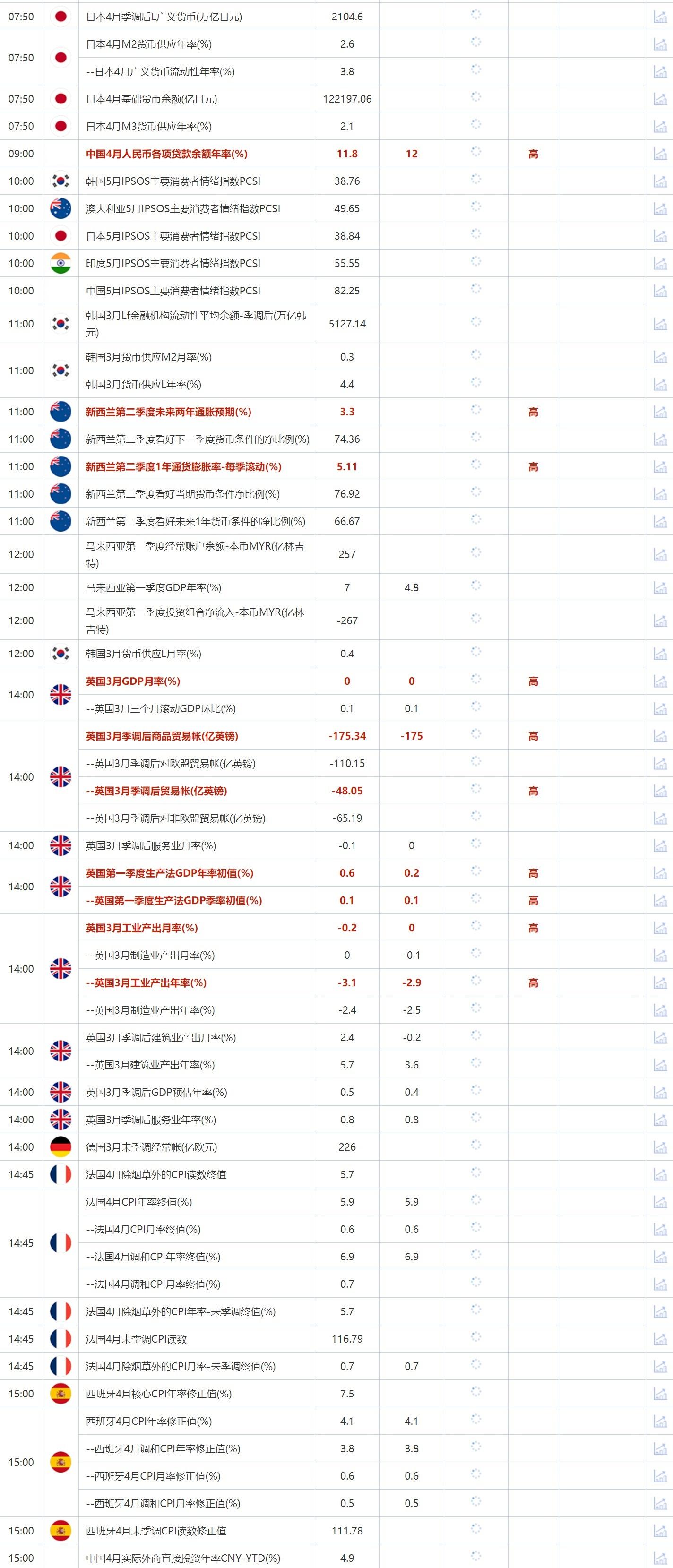 09:00 中国4月人民币各项贷款余额年率(%) , 前值 11.8 , 预期值 12 , 公布值:待发布10:00 韩国5月IPSOS主要消费者情绪指数PCSI , 前值 38.76 , 预期值 -- , 公布值:待发布
