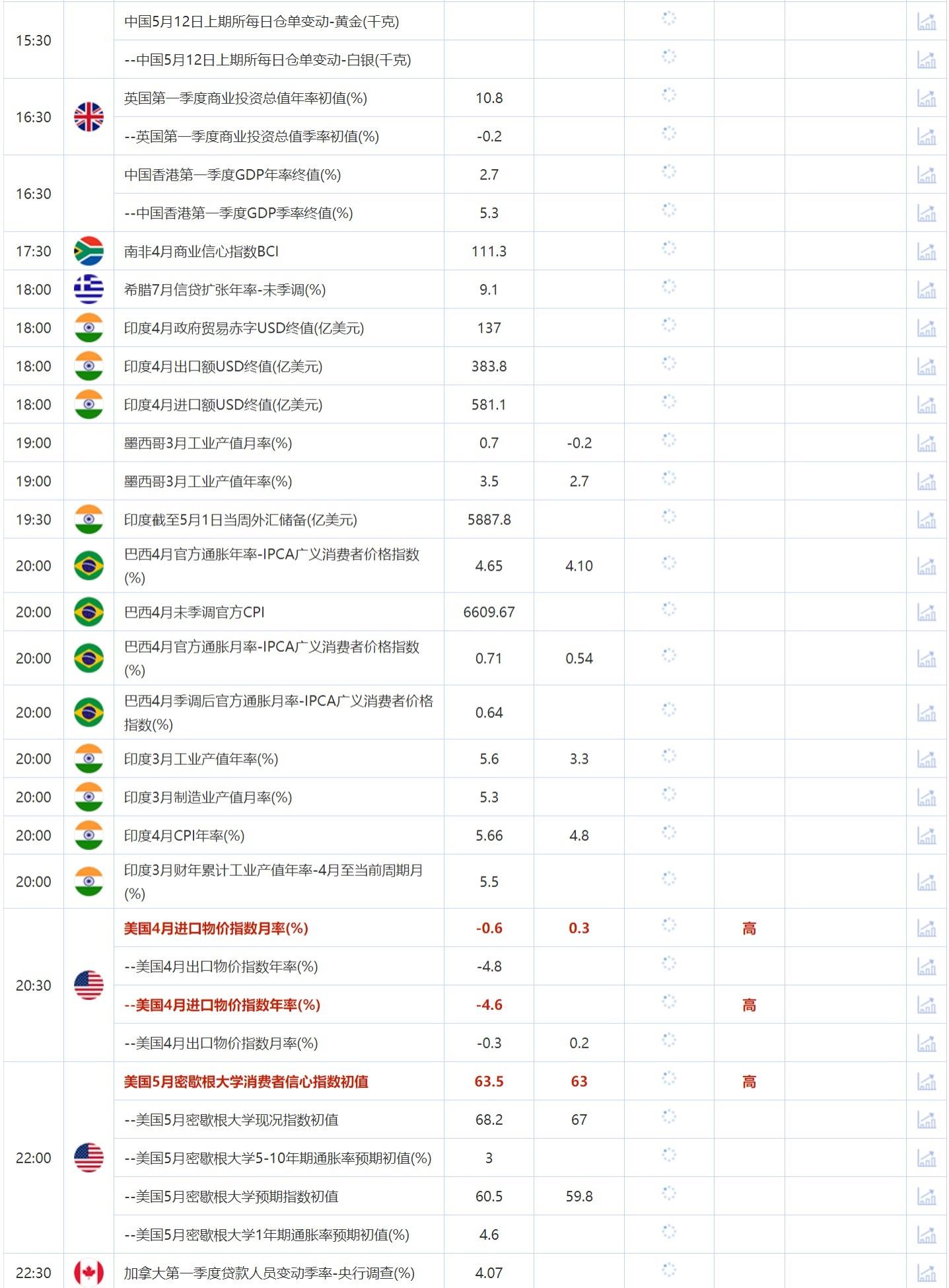 20:30 --美国4月进口物价指数年率(%) , 前值 -4.6 , 预期值 -- , 公布值:待发布20:30 --美国4月出口物价指数月率(%) , 前值 -0.3 , 预期值 0.2 , 公布值:待发布