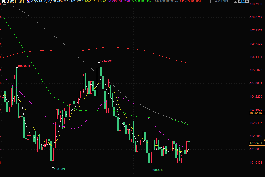 美元指数纽约尾盘上涨0.7%,至102.06,为一周多以来最高。