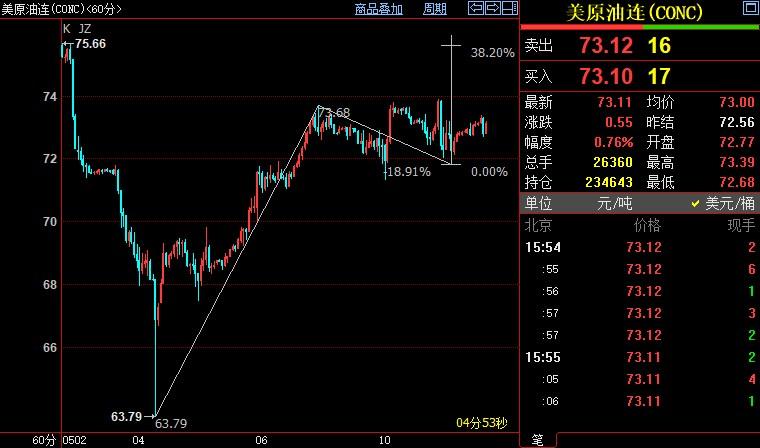 小时图上,若NYMEX原油自71.81美元开启上行c浪走势,上方阻力看向23.6%目标位74.14美元和38.2%目标位75.59美元。c浪是自63.79美元开启的反弹(ii)浪的子浪。