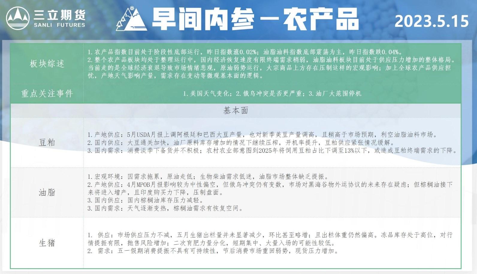 标题:三立期货5月15日早间内参——农产品