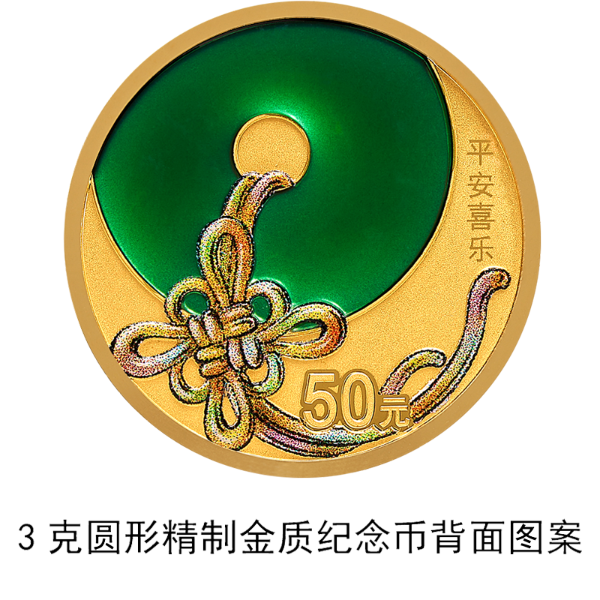 3克圆形金质“平安喜乐”纪念币背面图案为平安扣、中国结装饰组合图案,并刊“平安喜乐”字样及面额。