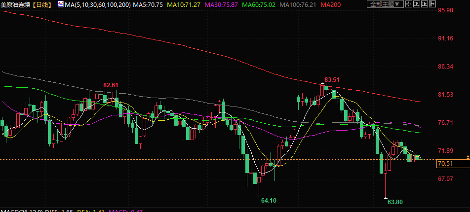 美原油交投于70.56美元/桶附近;油价周二下跌,因为经济数据弱于预期,抵消了国际能源署(IEA)对全球需求增加的预测的影响,且联合国发布经济展望报告显示全球经济强劲复苏的前景仍黯淡,市场等待美国债务上限会议结果出炉。