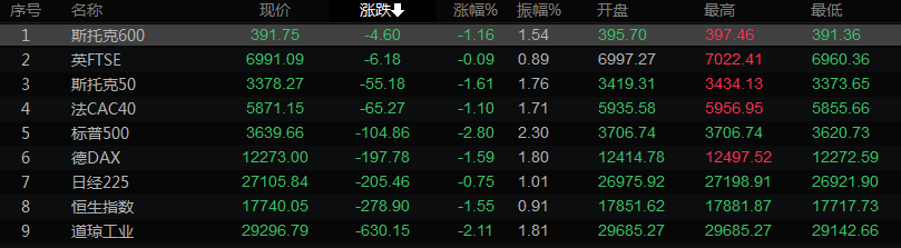 标普500指数下跌2.80%,报3639.66点;纳斯达克指数下跌3.8%,报10652.41点。