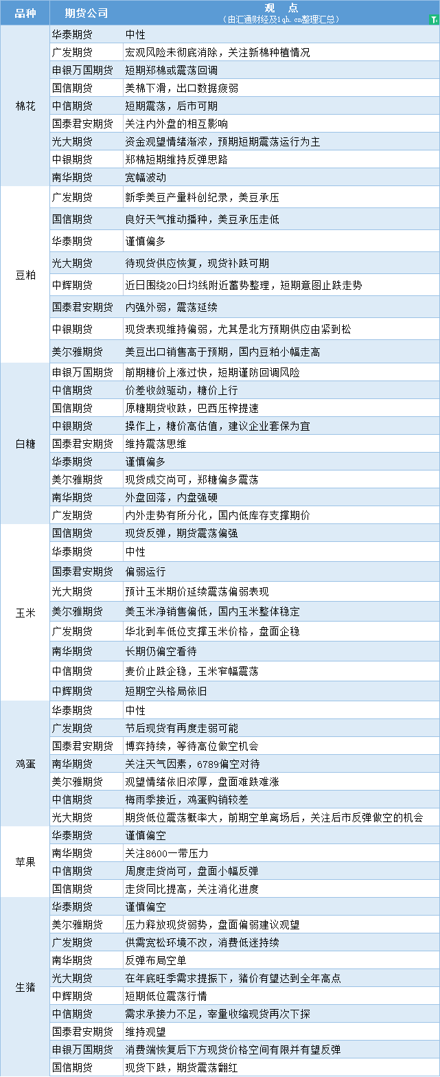 期货公司观点汇总一张图:5月19日农产品(棉花、豆粕、白糖、玉米、鸡蛋、生猪等)