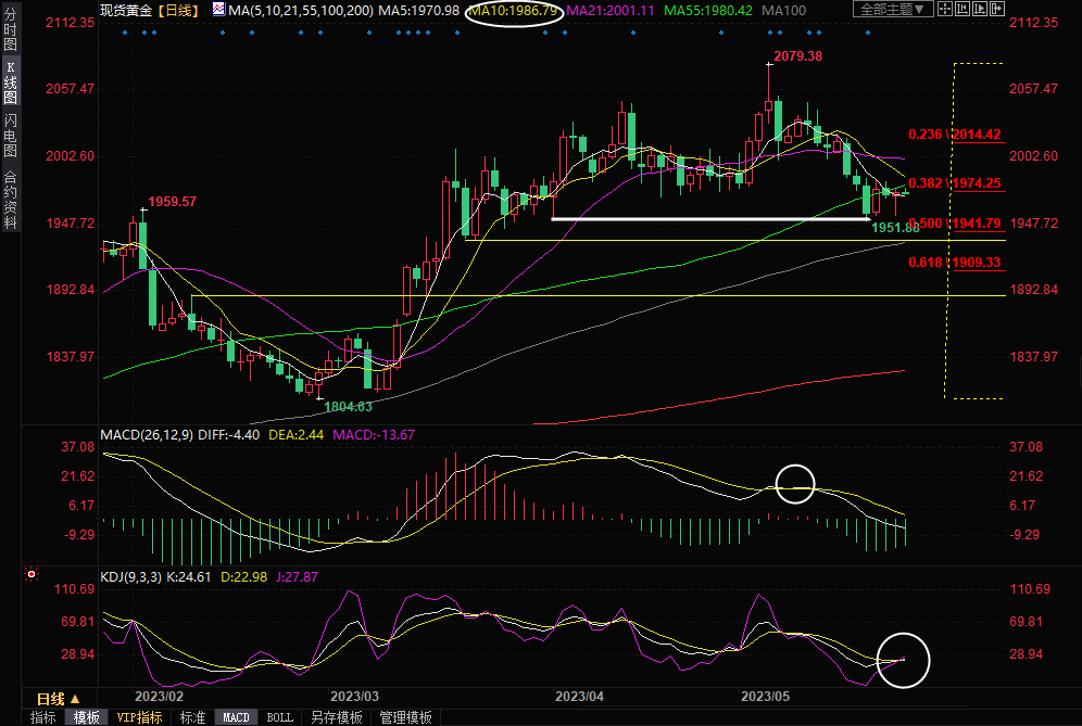 整体来看,虽然债务违约担忧给金价提供了一些避险支撑,但该因素同样支撑美元,美元目前表现非常强势,美债收益率虽然周二冲高回落,但仍处于近两个月高位,美国经济数据相对强劲,会进一步打压美联储年内降息预期,这对金价不利,而且市场仍普遍预计美国债务上限谈判有望在最后一刻达成协议,这也限制金价的反弹空间,预计后市金价仍偏向震荡下行,继续关注1950关口一线支撑,上方关注10日均线1986.79附近阻力。北京时间09:44,