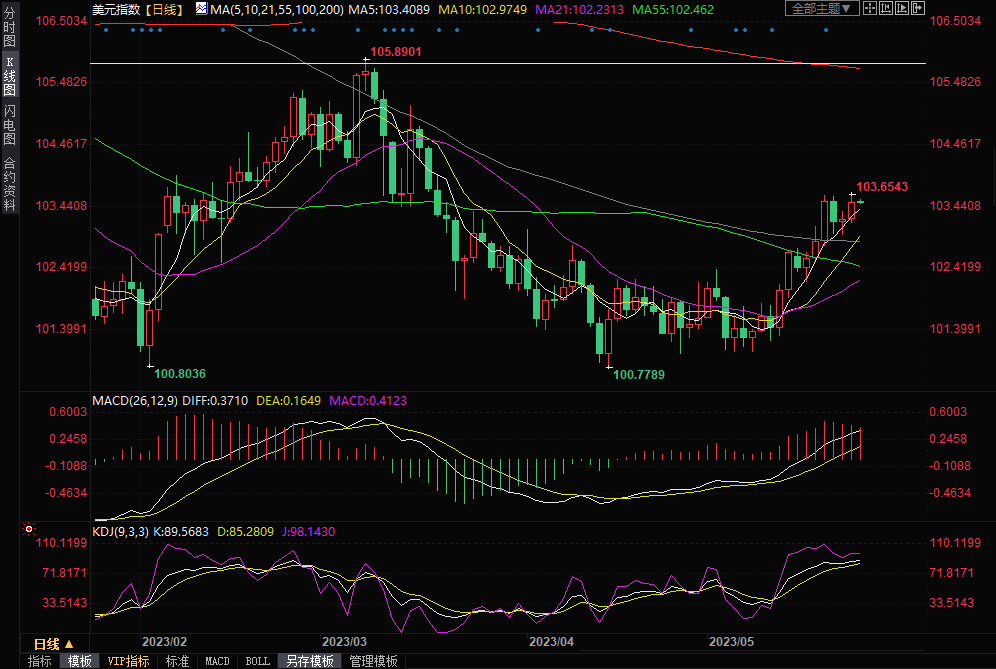 美元指数周二也受到避险情绪的支撑,美元兑一篮子货币周二触及两个月高位,提高美国债务上限的谈判缺乏进展,打击投资者的风险胃纳。