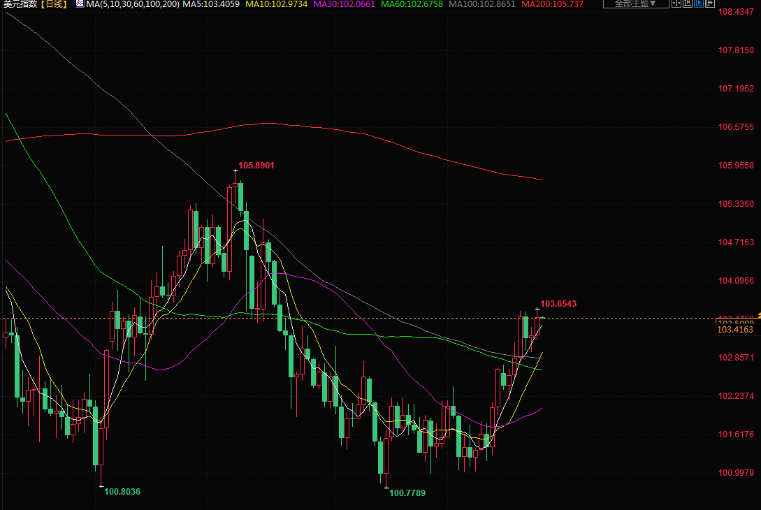 美元指数一度触及103.65的3月20日以来最高水平,纽约盘尾报103.55。