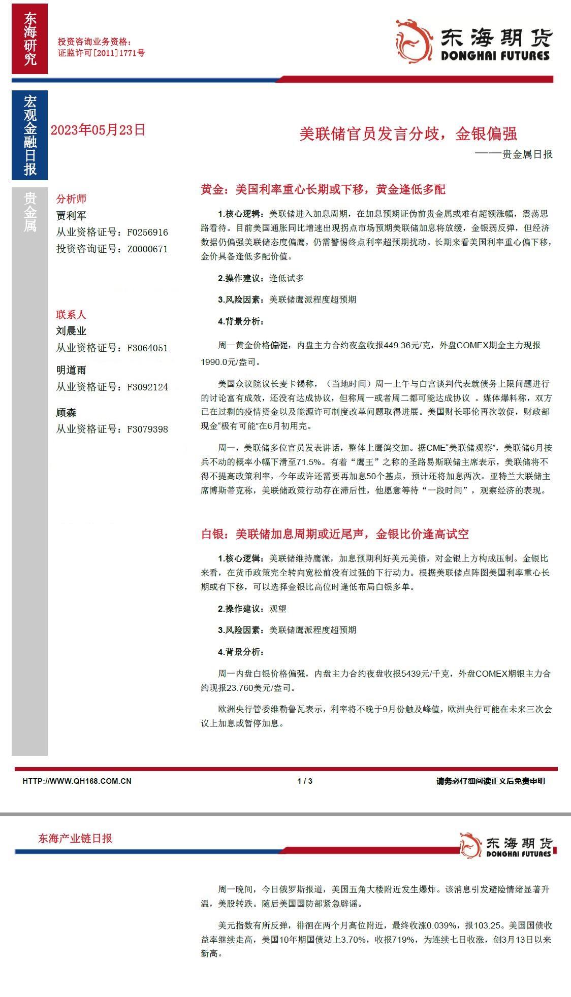 标题:【东海期货5月23日产业链日报】贵金属篇:美联储官员发言分歧,金银偏强