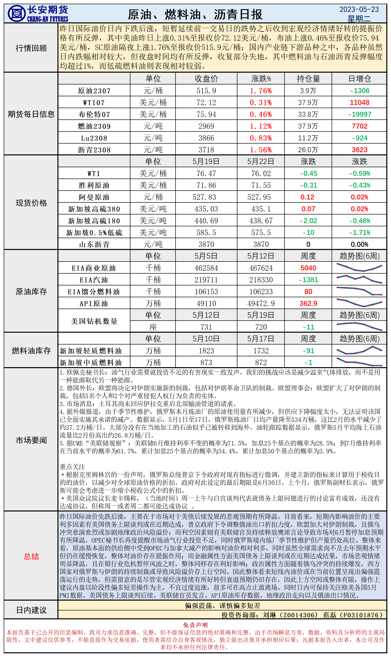 标题:长安期货5月23日原油日报:债务上限谈判提振市场情绪,油价或延续走势偏强震荡