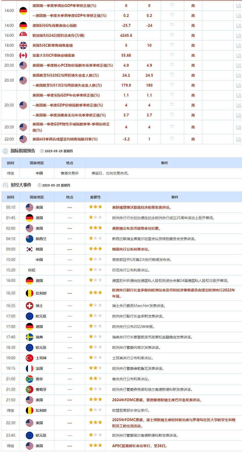 4.裕信银行:若美国达成债务上限协议 美元涨幅可能有限;①裕信银行研究公司表示,如果美国达成债务上限协议,美元最初可能上涨,但避险需求的减少可能侵蚀美元的部分涨幅。即便在这种情况下,美元还可能从投资者进一步缩减美联储降息预期的举措中得到支撑;