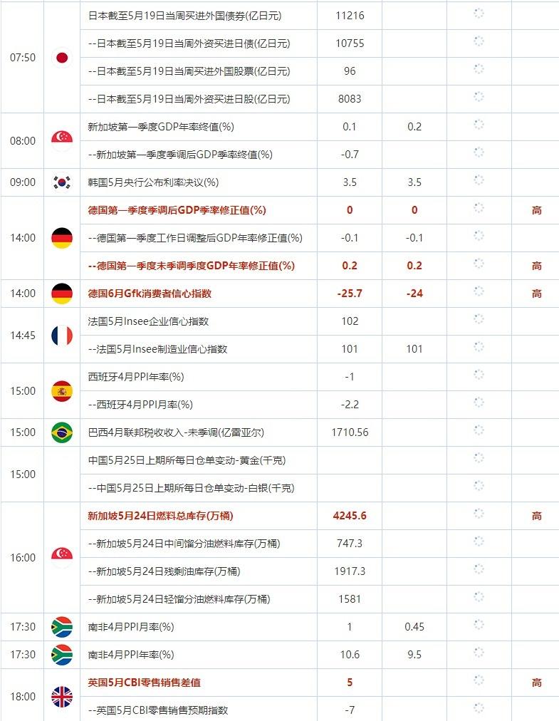 14:00 德国6月Gfk消费者信心指数 , 前值 -25.7 , 预期值 -24 , 公布值:待发布14:45 法国5月Insee企业信心指数 , 前值 102 , 预期值 -- , 公布值:待发布