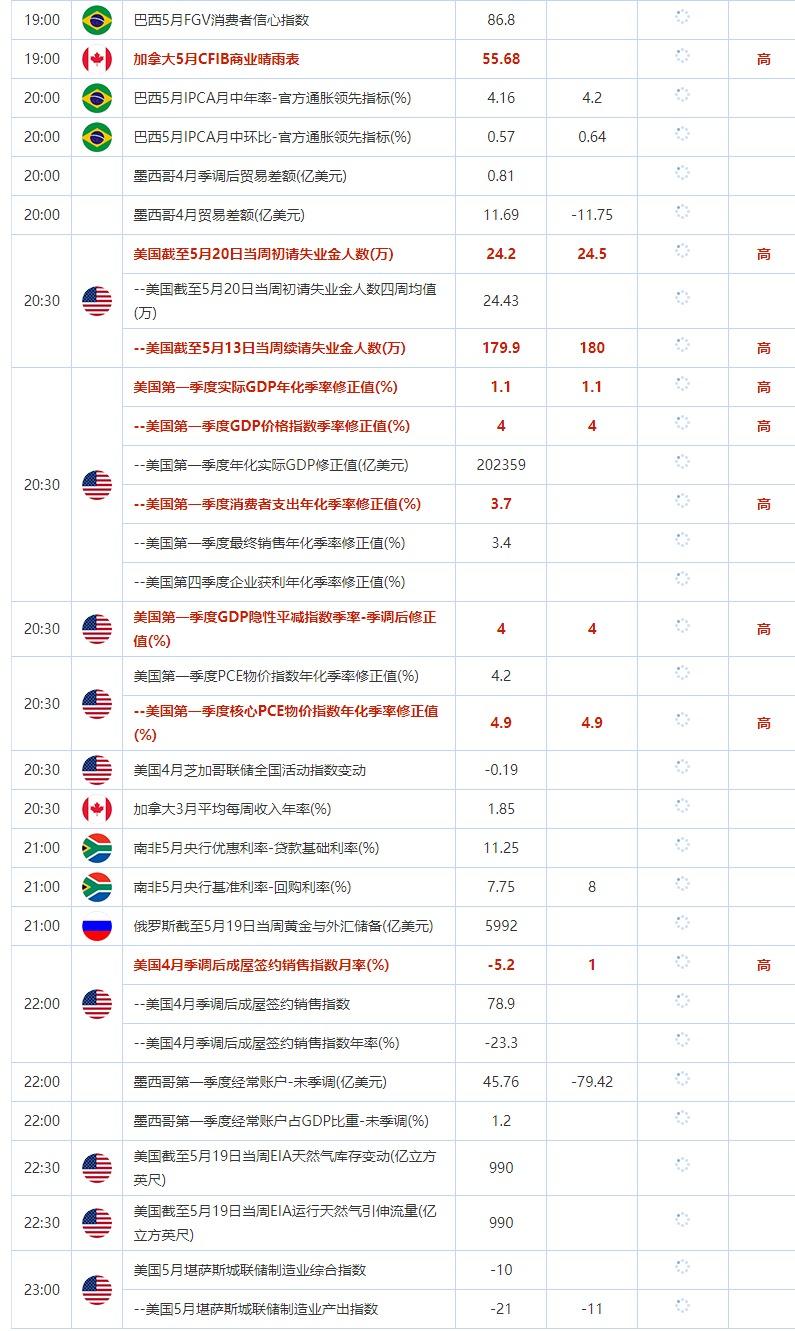 20:30 美国第一季度核心PCE物价指数年化季率修正值(%) , 前值 4.9 , 预期值 4.9 , 公布值:待发布20:30 美国截至5月20日当周初请失业金人数(万) , 前值 24.2 , 预期值 24.5 , 公布值:待发布20:30 美国截至5月13日当周续请失业金人数(万) , 前值 179.9 , 预期值 180 , 公布值:待发布20:30 美国截至5月20日当周初请失业金人数四周均值(万) , 前值 24.43 , 预期值 -- , 公布值:待发布