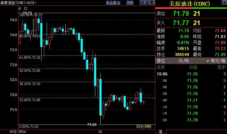 小时图上看,NYMEX原油多空双夺71.88美元,它是74.73美元-71美元下行区间的23.6%斐波那契回档位。若站上该价位,后市料进一步上摸38.2%斐波那契回档位72.42美元;反之,油价料重启跌势,并跌破71美元。