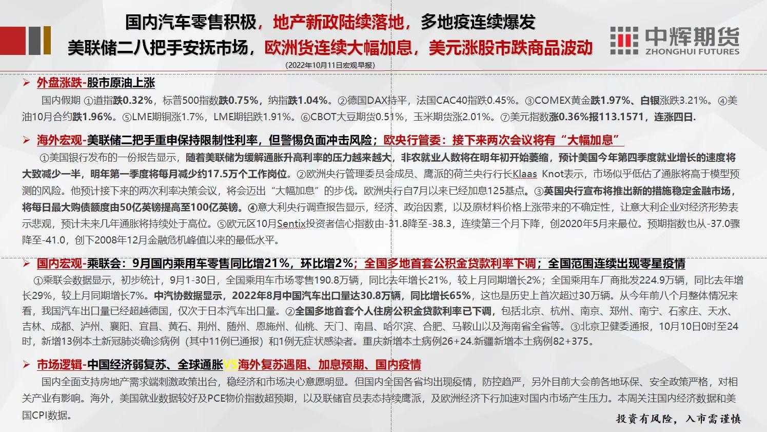 标题:中辉期货宏观早报:美联储官员表态持续鹰派,欧洲经济下行加速,关注美国9月CPI数据