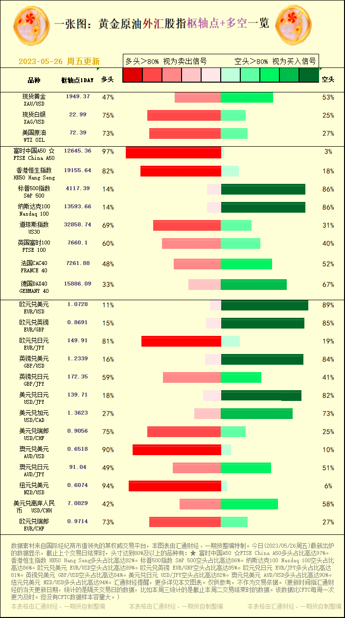 标题:一张图:2023/05/26黄金原油外汇股指"枢纽点+多空占比"一览