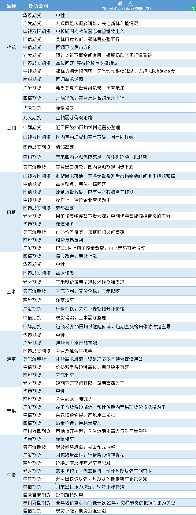 标题:期货公司观点汇总一张图:5月26日农产品(棉花、豆粕、白糖、玉米、鸡蛋、生猪等)