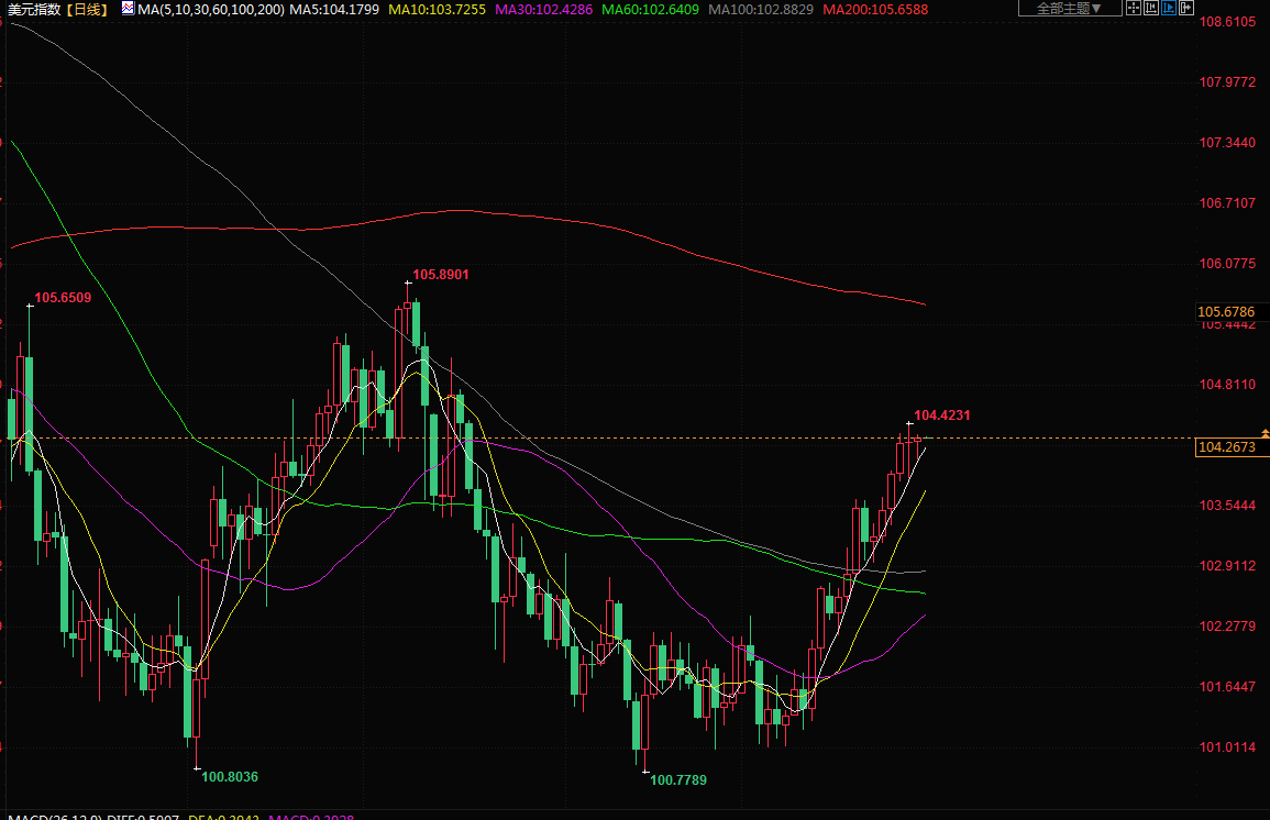 美元指数小跌至约104.23,但距离上周触及的两个月高位不远。