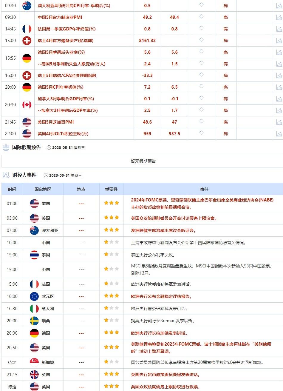 与此同时,美元交投震荡,此前美国总统拜登和共和党籍众议院议长麦卡锡上周日达成了一项协议,将暂停实施美国债务上限,并对一些联邦开支进行限制,以防止出现债务违约。