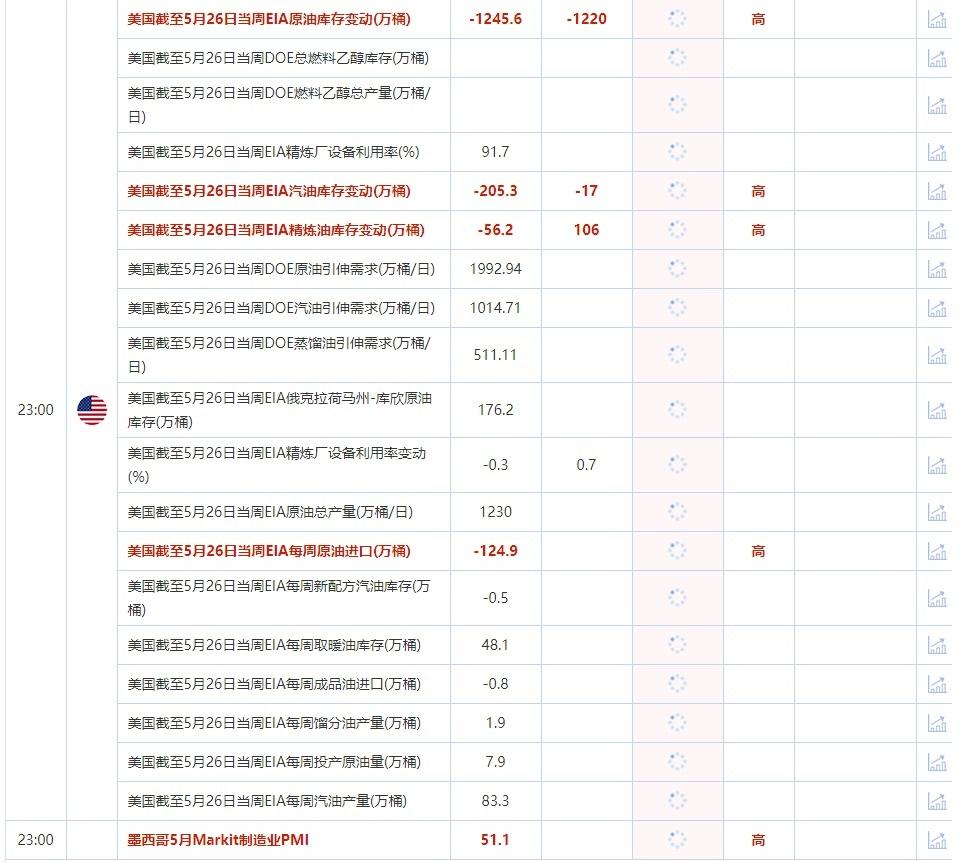 23:00 美国截至5月26日当周EIA原油库存变动(万桶) , 前值 -1245.6 , 预期值 -1220 , 公布值:待发布23:00 美国截至5月26日当周DOE总燃料乙醇库存(万桶) , 前值 需加前值 , 预期值 -- , 公布值:待发布