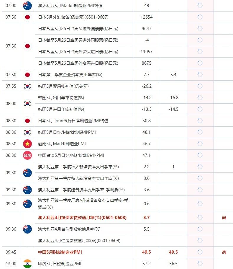 09:45 中国5月财新制造业PMI , 前值 49.5 , 预期值 49.5 , 公布值:待发布13:00 印度5月日经制造业PMI , 前值 57.2 , 预期值 56.5 , 公布值:待发布